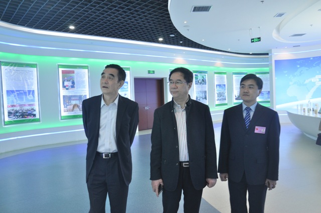 圖為中國醫藥企業管理協會會長郭云沛(左一)一行參觀我公司展廳時的情景