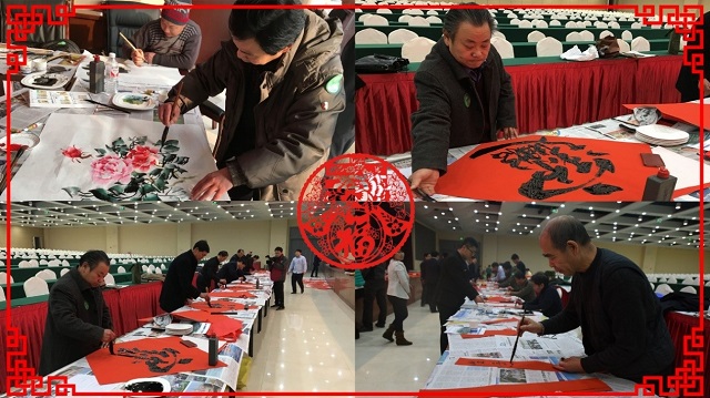 活動(dòng)現(xiàn)場(chǎng),書法家們調(diào)墨弄筆, 鸞翔鳳翥。他們的作品有的行云流水;有的遒美健秀;有的委婉含蓄;有的酣暢瀟灑;嫻熟的書法技藝,讓在場(chǎng)的公司員工們不禁贊嘆,同時(shí)也被他們認(rèn)真、執(zhí)著的精神所感動(dòng)。他們?nèi)硇牡耐度氲阶髌分校恢钡较挛鐑牲c(diǎn)才休息,共創(chuàng)作春聯(lián)1500余副,中國(guó)畫20余幅。一副副帶有新年祝福的大紅春聯(lián),把羅欣會(huì)堂渲染的格外喜慶。