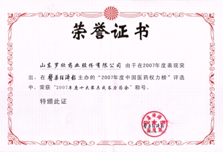 我公司在獲得“2006年度十大最具成長力藥企”的基礎上,再次在醫藥經濟報主辦的“2007年中國醫藥權力榜”評選中,榮獲“2007年度十大最具成長力藥企”稱號。