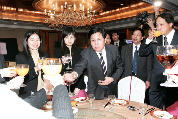 臨沂市副市長(zhǎng)、羅莊區(qū)區(qū)委書(shū)記李峰在慶功會(huì)上共同舉杯祝賀羅欣藥業(yè)的成功上市