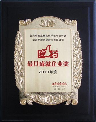 2010年12月8日,第64屆全國(guó)藥品交易會(huì)召開(kāi)之際,醫(yī)藥觀察家報(bào)社在江西南昌召開(kāi)了“十二五規(guī)劃•醫(yī)藥新格局高峰論壇暨《醫(yī)藥觀察家》精英俱樂(lè)部年會(huì)”。會(huì)上評(píng)選了十大醫(yī)藥精英獎(jiǎng)、最具投資價(jià)值企業(yè)獎(jiǎng)、最具市場(chǎng)潛力新品獎(jiǎng)和最具成就企業(yè)獎(jiǎng)四大獎(jiǎng)項(xiàng),我公司榮獲最具成就企業(yè)獎(jiǎng),中國(guó)醫(yī)藥企業(yè)管理協(xié)會(huì)、中國(guó)醫(yī)藥企業(yè)家協(xié)會(huì)會(huì)長(zhǎng)、北京醫(yī)藥集團(tuán)公司名譽(yù)董事長(zhǎng)、醫(yī)藥經(jīng)濟(jì)報(bào)首席專家、國(guó)家發(fā)展改革委員會(huì)生物醫(yī)藥專家委員會(huì)副主任、國(guó)家科技部國(guó)家重大專項(xiàng)專家委員會(huì)專家于明德給獲獎(jiǎng)單位頒發(fā)了獎(jiǎng)牌和證書(shū)。