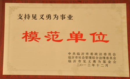 我公司自成為見義勇為基金會理事單位以來,積極響應(yīng)基金會號召,多次向基金會捐款,用實際行動支持全市見義勇為事業(yè)的發(fā)展,為建設(shè)平安臨沂、維護全市和諧穩(wěn)定貢獻了自己的一份力量。此次被評為“支持見義勇為事業(yè)模范單位”榮譽稱號是市委政法委、市綜治委、市見義勇為基金會對我公司見義勇為工作的肯定,也是激勵,我們將以此為基礎(chǔ)和新的起點,為全市見義勇為事業(yè)貢獻更多力量。